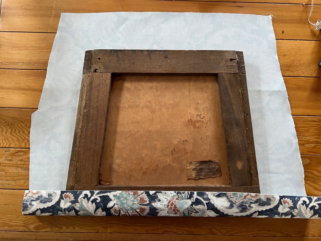 I purchased the fabric from FabricLand. It’s a nice thick, soft upholstery fabric. It was on sale, and cost less than $10. I removed the old fabric and cut a new piece the same size. Then I used a staple gun to work my way around the seat, stapling down the fabric.