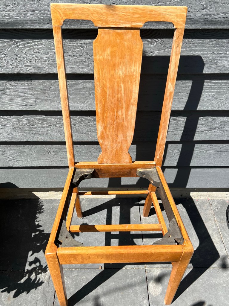 I first removed the seat from the chair. Next, I sanded the chair, and primed and painted it using the paint we’d been using for the trim work in the house. Chairs aren’t my favourite thing to paint because of the legs and chair back – you can’t just use a roller and be done! But it didn’t take long. I did 1 coat of primer and 2 coats of white paint. Already it looked like a different chair!